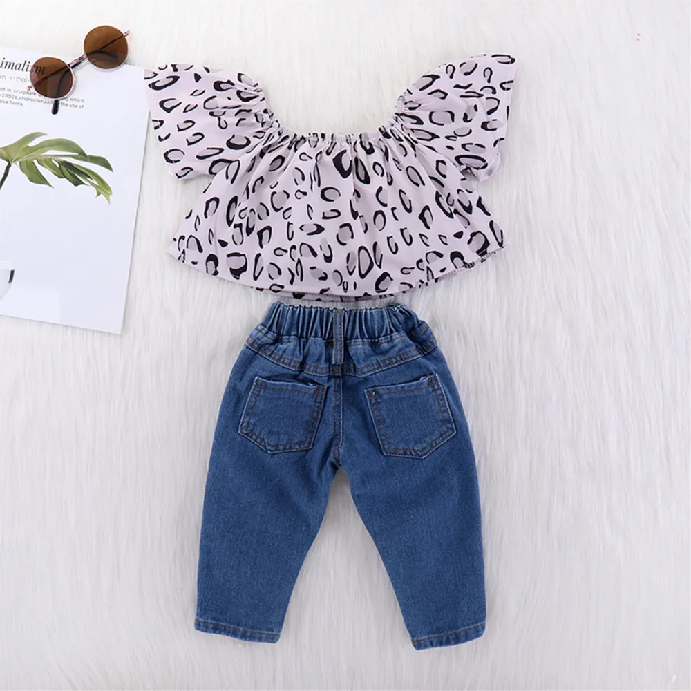 Cheap Offer of 2pcs Toddler Infant Baby Girls Leopard Print Flying Sleeve Tops TShirt Jeans Pants Outfits Clothes