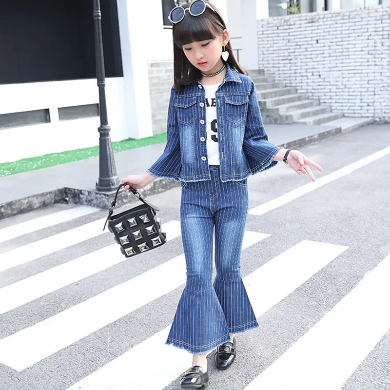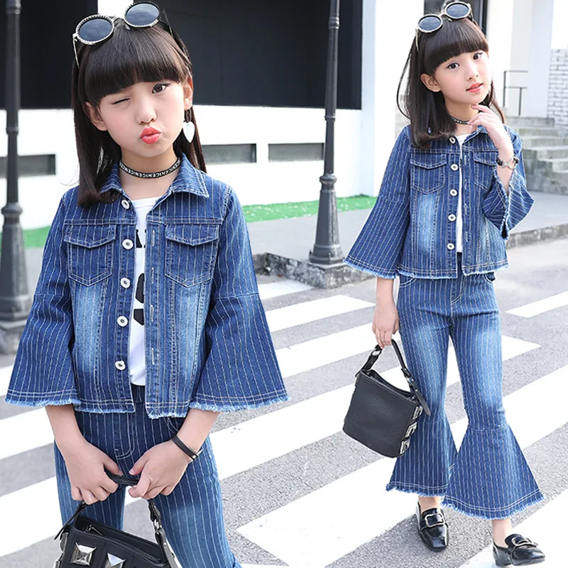 Buy Children's stripe wear clothes suit spring and autumn 2019 new denim horn sleeve jacket+ jean flare Right Here and Right Now Just for USD US $23.92, Price will be rise up at any time without notification and I cant guaranted that the stock is still available tommorow or next hour. So Please Save It Now!